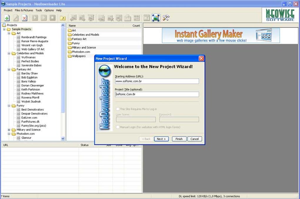 O NeoDownloader faz o trabalho duro de forma automática. Basta você indicar o endereço URL do site e definir no menu “Project Settings” o tamanho e tipo de imagens que quer baixar. É possível criar vários projetos e baixar fotos de vários sites ao mesmo tempo.